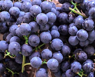 Blue Concord GrapesVarying in colour from deep blue to purple or almost black. Seedy flesh is almost translucent with a slight green tinge and is both tangy and rich.