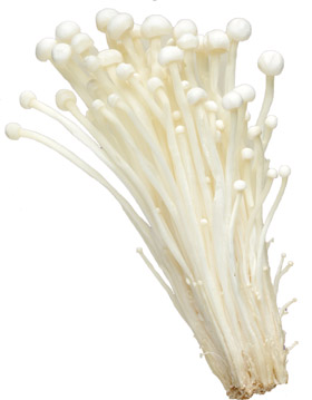 Enoki MushroomsEnoki Mushrooms are recognized by their almost pure white colour and long stems topped with petite, convex caps.