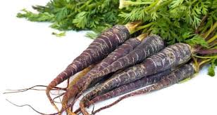 Marroon Bunch CarrotsWine coloured baby carrots with green tops still attached.
