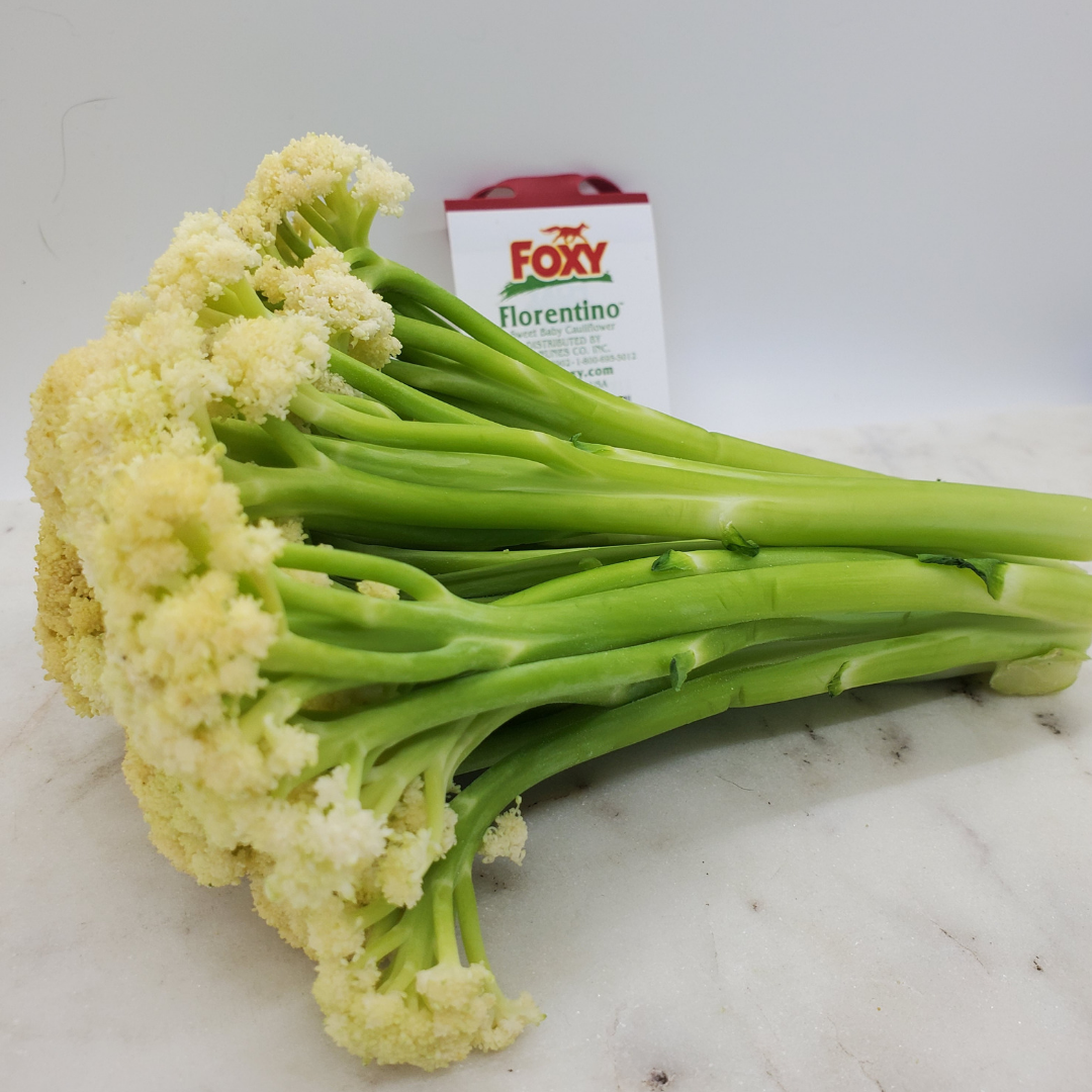 Florentino Baby CauliflowerLong green stems with cream-coloured, open florets growing in bunches at the tops. The heads are firm, with a few large, cabbage-like leaves growing around them. The entirely edible stems and flowers offer a succulent texture and sweet, nutty flavour.