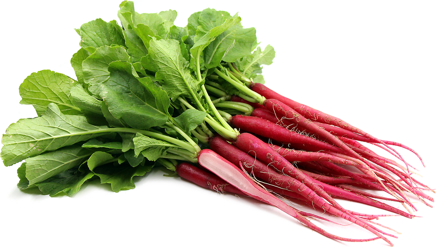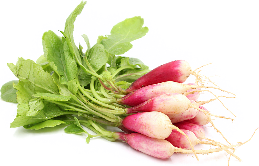 French Breakfast RadishVibrant colouring which graduates from a vivid fuchsia-red to bright white at the tip and topped with edible, leafy greens.