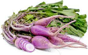 Ninja RadishExterior skin is a vibrant purple. Their interior flesh is a star like burst of lavender to dark purple atop a white background.