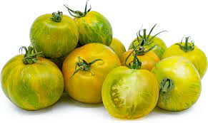 Zebra TomatoesThe skin is smooth and taut with a light green base, covered in mottled, vertical striping. Zebra Tomatoes have a tart, astringent flavour when young, transitioning into a balanced blend of sweet and tangy flavours with maturity.