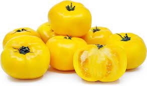 Yellow Hothouse TomatoesThick skin and succulent, meaty, and very weighty flesh, as they naturally have a high water content. Yellow tomatoes are rather sweet, and often taste milder and less acidic than red tomatoes because the different pigments in various coloured tomato varieties produce different balances of sugars and acids.