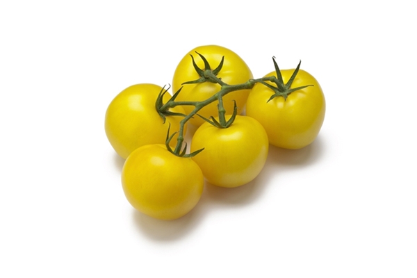 Yellow Vine Cluster TomatoesStem-on, with four or five tomatoes to each vine. As they are allowed to ripen they develop a higher sugar content and lower acidity.